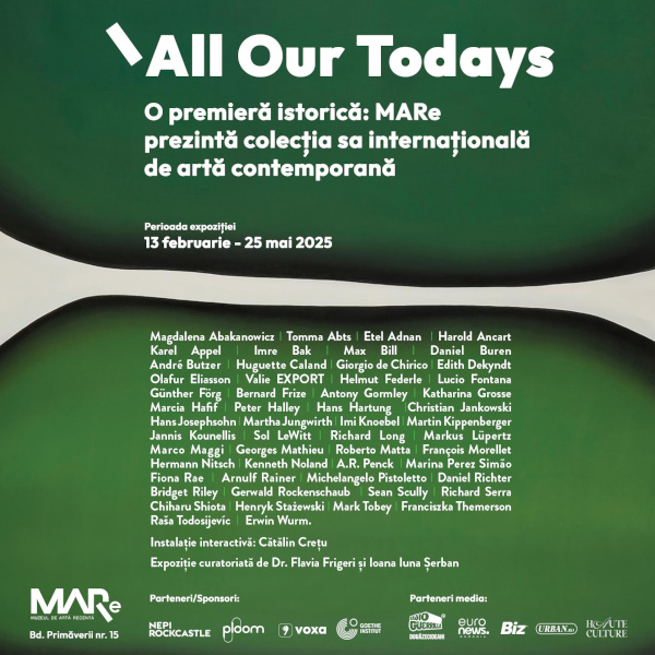 Expoziția curatoriată de Dr. Flavia Frigeri și Ioana Iuna Șerban, All Our Todays, prezintă, în premieră, peste 60 de lucrări din colecția internațională de artă contemporană a muzeului și explorează dialogul între arta figurativă și cea abstractă, invitând publicul să descopere diversele moduri în care artiștii internaționali au reprezentat ideea de contemporaneitate prin experiențele lor personale și perspectivele unice asupra lumii.